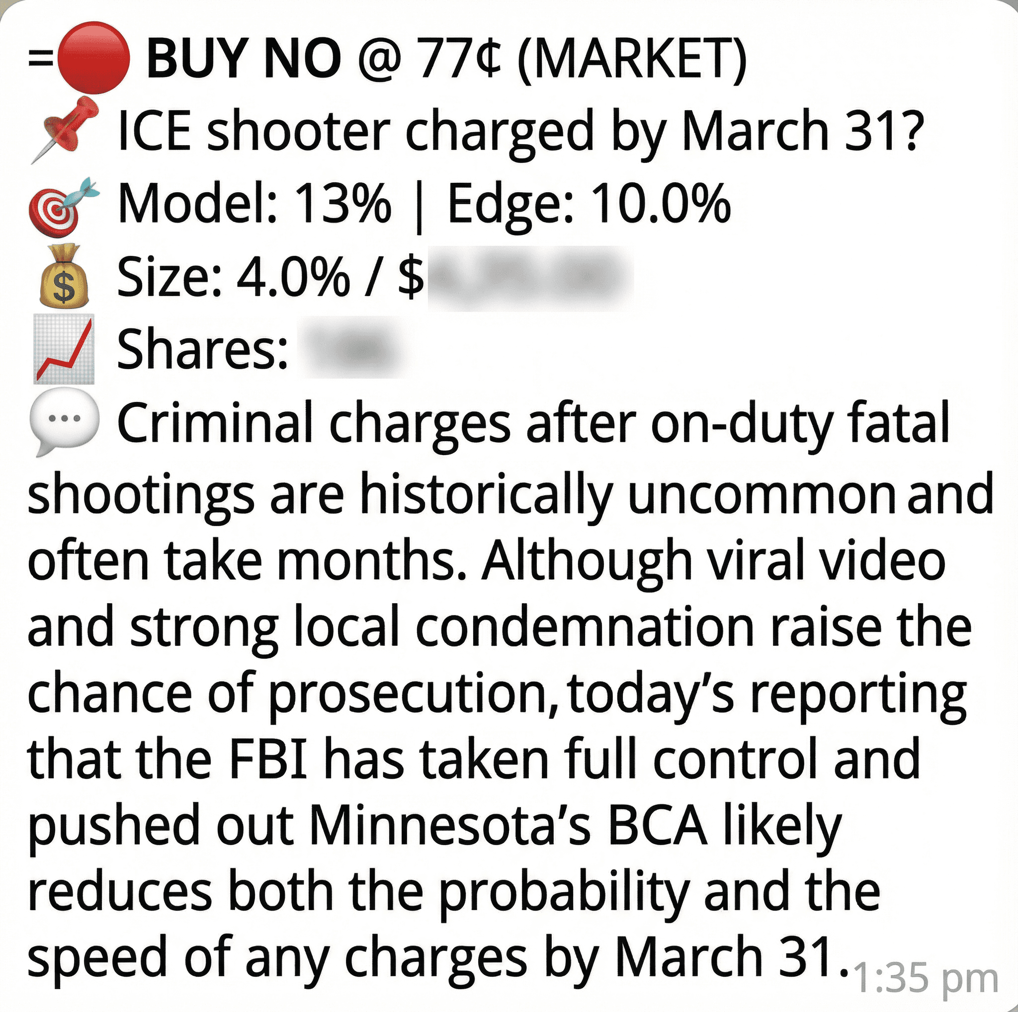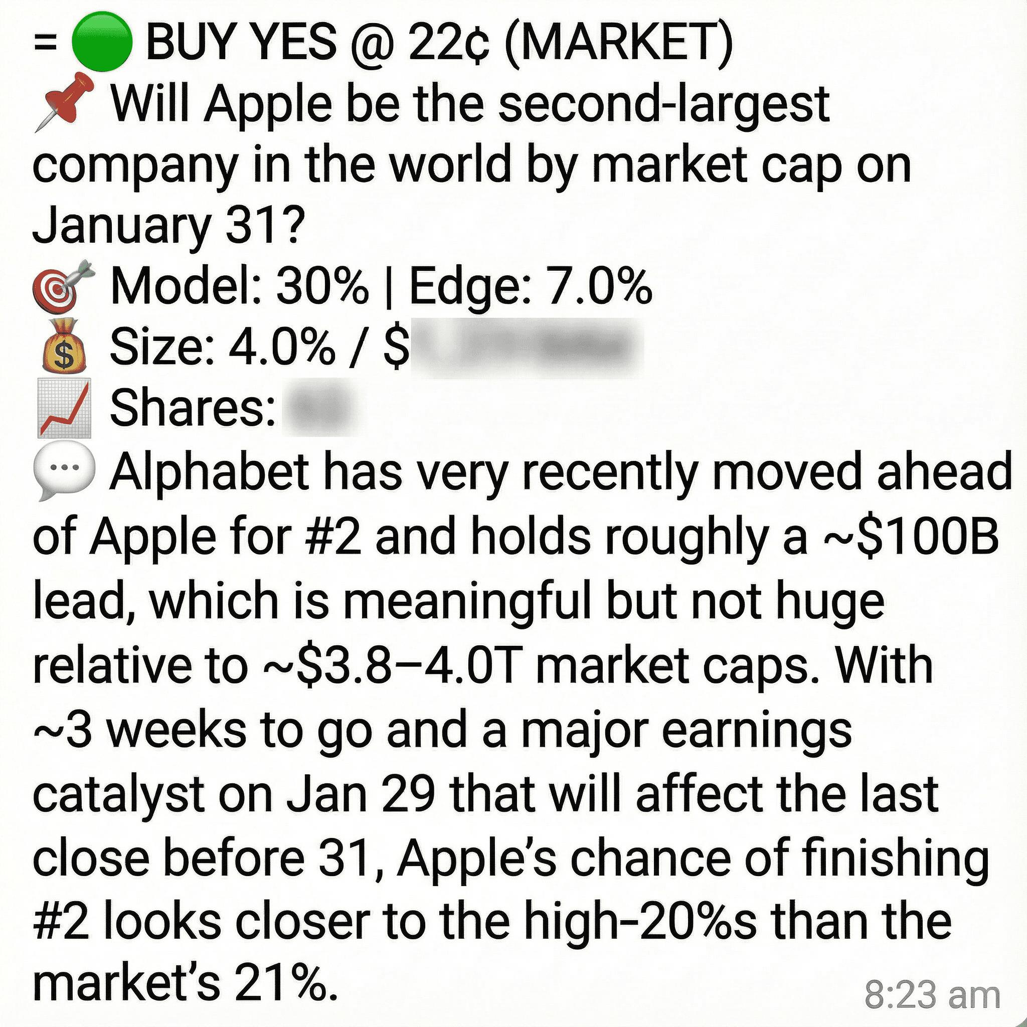 Step 4 — Structured output: You receive a clear summary: estimated ‘true’ probability, directional bias, sizing guide, rationale for the estimate, topic category, and timestamp.